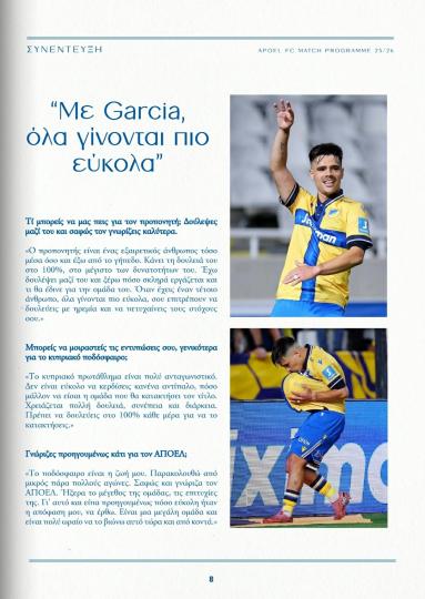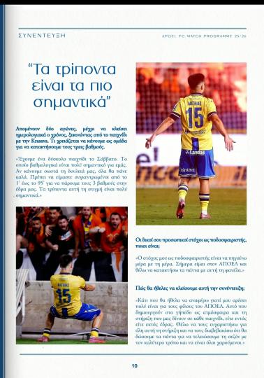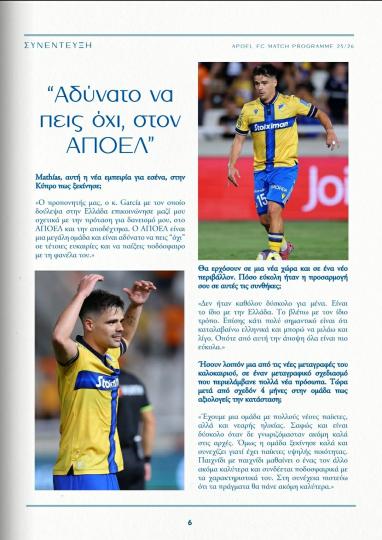 Παράλληλα, αναφέρεται στις εντυπώσεις του από το κυπριακό πρωτάθλημα, το οποίο χαρακτηρίζει ιδιαίτερα ανταγωνιστικό, επισημαίνοντας πως «δεν είναι εύκολο να κερδίσεις κανένα αντίπαλο» και πως η κατάκτηση του τίτλου απαιτεί συνέπεια και συγκέντρωση σε κάθε αγωνιστική. Ο ΑΠΟΕΛ, όπως λέει, δεν έχει το περιθώριο να χαλαρώσει ούτε απέναντι σε αντιπάλους που βρίσκονται χαμηλότερα στη βαθμολογία, όπως η αντίπαλος που έρχεται στο ΓΣΠ. Σε πιο προσωπικό τόνο, ο Ματίας Τομάς μιλά για τον στόχο του να «πηγαίνει μέρα με τη μέρα» και να κατακτήσει «τα πάντα με αυτή τη φανέλα», ενώ κλείνει τη συνέντευξη ευχαριστώντας τους φίλους του ΑΠΟΕΛ για τη στήριξή τους, εκφράζοντας την επιθυμία να τους ανταποδώσει τη στήριξη στο μέγιστο βαθμό.