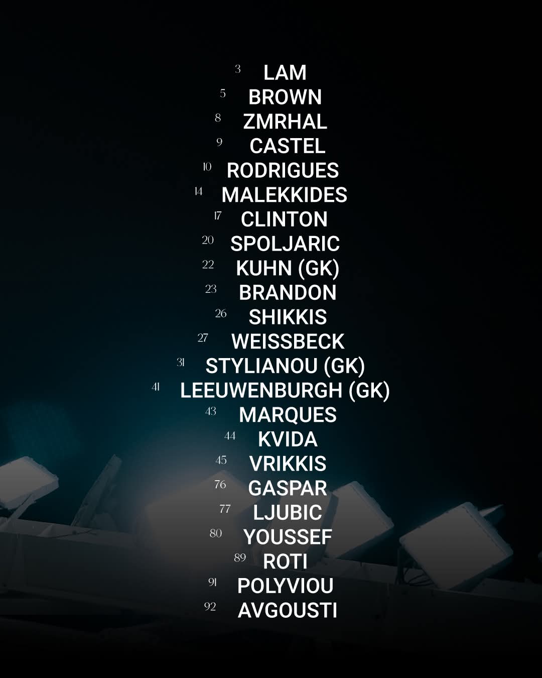 ΑΝΑΛΥΤΙΚΑ: Κουν, Λέουφενμπεργκ, Στυλιανού, Λαμ, Μπράουν, Ζμρχαλ, Καστέλ, Ροντρίγκες, Μαλεκκίδης, Ντουοντού, Σπόλιαριτς, Τόμας, Σίκκης, Βάισμπεκ, Μάρκες, Κβίντα, Βρικκής, Γασπάρ, Γιουσέφ, Λιούμπιτς, Ρώτη, Πολυβίου, Αυγουστή.