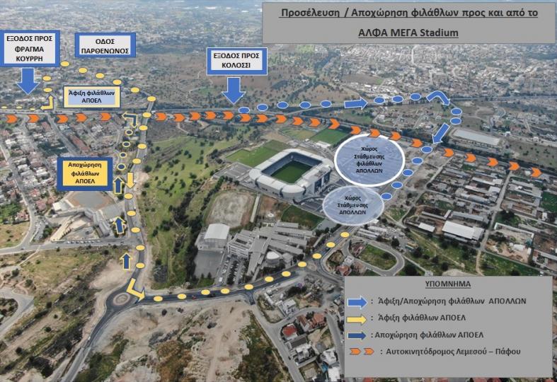 Για την ομαλή προσέλευση και αποχώρηση τους προς και από το στάδιο, οι οπαδοί της ομάδας του ΑΠΟΕΛ καλούνται να κατευθυνθούν προς το ΑΛΦΑΜΕΓΑ Stadium, μέσω του αυτοκινητόδρομου προς Πάφο, να ακολουθήσουν την έξοδο προς Φράγμα Κούρρη και στη συνέχεια μέσω της οδού Παρθενώνος (1ο στρίψιμο δεξιά). Ακολούθως από την 1η έξοδο (αριστερά) του νέου κυκλικού κόμβου, να κατευθυνθούν προς το στάδιο. Σχετικό σχεδιάγραμμα των δρομολογίων των φίλων των δύο ομάδων επισυνάπτεται.