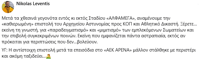 Παρέμβαση στα μέσα κοινωνικής δικτύωσης από τον εκπρόσωπο τύπου της ΑΕΛ Νικόλα Λεβέντη, παίρνοντας θέση για τα όσα έγιναν μετά το τέλος του Απόλλων-ΑΠΟΕΛ.