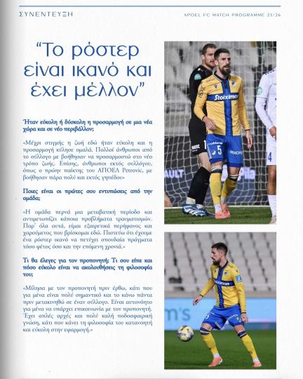 Θα ήθελες να στείλεις ένα προσωπικό μήνυμα στους φιλάθλους; «Θα ήθελα απλώς να ζητήσω από τους φιλάθλους μας, από όλους όσοι αγαπούν αυτόν το σύλλογο εδώ και χρόνια και από τα παιδιά που μεγαλώνουν αγαπώντας τον ΑΠΟΕΛ, να πιστεύουν και να είναι δίπλα μας στο γήπεδο. Ξέρω ότι δεν είναι πάντα εύκολο και δεν είναι πάντα όμορφα. Όμως δεν υπάρχει αληθινή αγάπη χωρίς πόνο και απογοήτευση. Το σημαντικό είναι να συνεχίζεις να αγαπάς και να μην τα παρατάς ποτέ.»