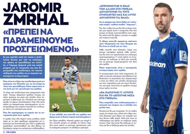 Με τη φανέλα του Απόλλωνα και με ξεκάθαρη φιλοσοφία εντός κι εκτός γηπέδου, ο Γιάρομιρ Ζμρχάλ μίλησε για τη μέχρι τώρα πορεία της ομάδας, τη σημασία της σταθερότητας, αλλά και τη νοοτροπία που πρέπει να διατηρείται ανεξαρτήτως αποτελεσμάτων. Ο Τσέχος ποδοσφαιριστής υπογραμμίζει την ανάγκη για προσγείωση, ομαδικό πνεύμα και συνεχή προσπάθεια.