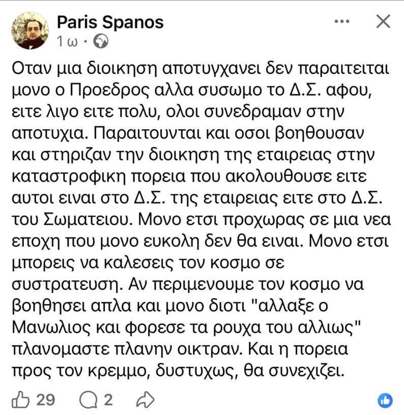 Αναλυτικά η ανάρτηση του Πάρι Σπανού: