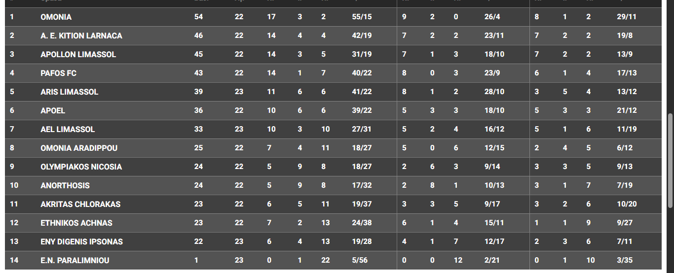 Την ίδια ώρα η ΑΕΛ πήρε ένα εύκολο διπλό κόντρα στην Ένωση και μείωσε την διαφορά από την 6η θέση στους 3 βαθμούς.