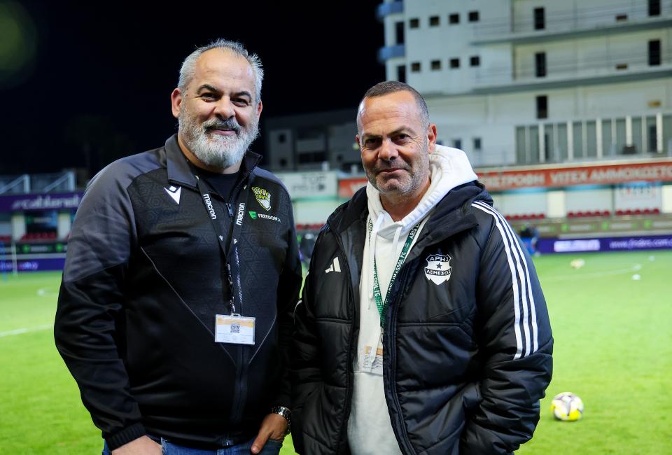 Χαμογελαστοί οι εκπρόσωποί τύπου των δύο ομάδων, Χριστόφορος Μιχαηλούδης και Κώστας Παπαδόπουλος στο στάδιο «Αμμόχωστος». Άψογοι στη δουλειά και στα καθήκοντα τους αμφότεροι, οι οποίοι περιμένουν από την ομάδα τους να κάνει το καθήκον της για ένα τρίποντο που θα τους ανεβάσει βαθμολογικά.
