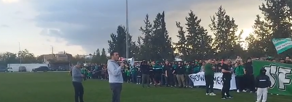 Οι οργανωμένοι φίλοι του «τριφυλλιού», μαζί με παλαίμαχους ποδοσφαιριστές, βρέθηκαν μαζικά στο πλευρό της ομάδας, δημιουργώντας μια μοναδική ατμόσφαιρα με συνθήματα και καπνογόνα.