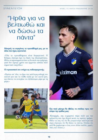 Όσο για τις φιλοδοξίες του, ήταν ξεκάθαρος: «Πρώτα απ΄όλα, να βρω την καλύτερη εκδοχή του εαυτού μου και να νιώθω καλά, έπειτα να συνεχίσω να εξελίσσομαι μέρα με τη μέρα. Ελπίζω στον ΑΠΟΕΛ να έρθουν πολλές νίκες και τίτλοι».