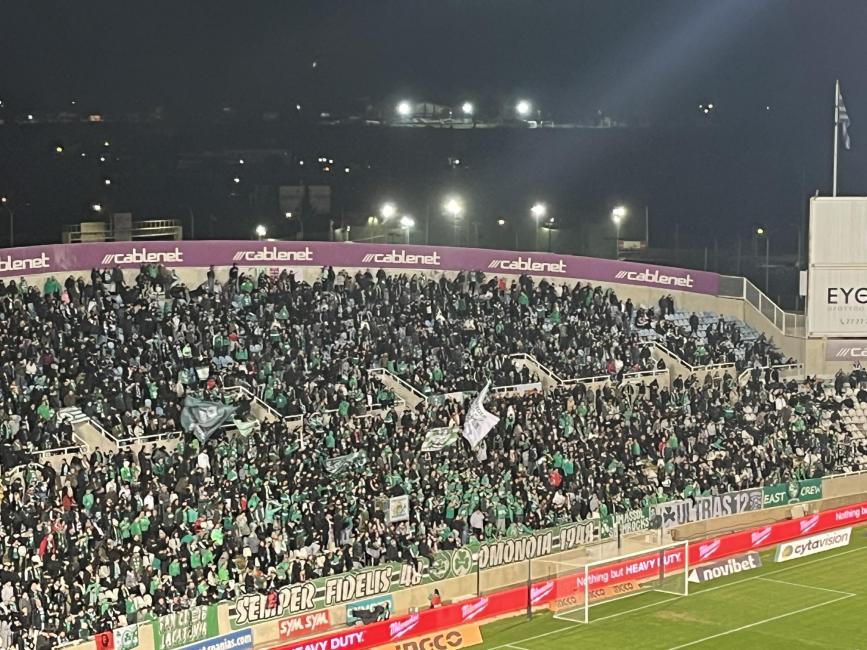 Η είσοδος των ομάδων στον αγωνιστικό χώρο του ΓΣΠ βρήκε τις κερκίδες «ντυμένες» στα πράσινα, με τους φίλους της Ομόνοιας να δημιουργούν ατμόσφαιρα αντάξια ντέρμπι κορυφής απέναντι στον Απόλλωνα.