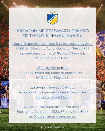 «Η πρώτη ενέργεια που στοχεύει σε οικονομική αλλά κυρίως αγωνιστική ενίσχυση του ΑΠΟΕΛ έχει ήδη ξεκινήσει. Καλούμε τον κόσμο να αποκτήσει πακέτο εισιτηρίων Playoffs και να ενισχύσει την ομάδα στην προσπάθεια της, για τους πιο κρίσιμους αγώνες της χρονιάς.