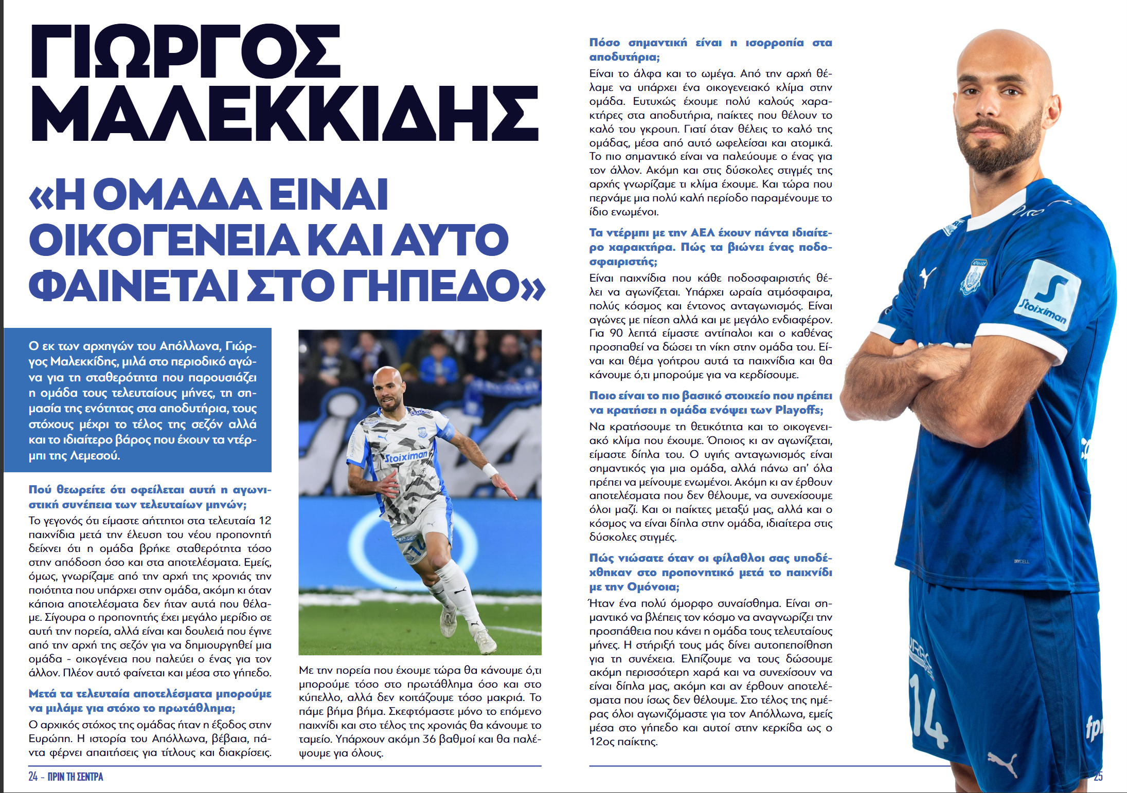 Ο εκ των αρχηγών του Απόλλωνα, Γιώργος Μαλεκκίδης, μίλησε στο περιοδικό του Απόλλωνα για τον αγώνα κόντρα στην ΑΕΛ