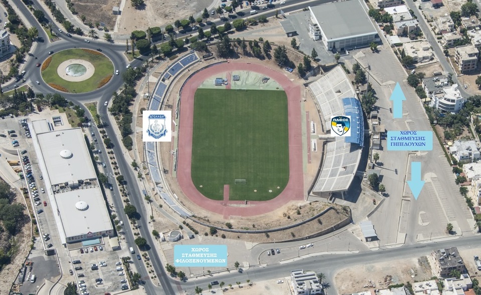 Οι φίλαθλοι της ομάδας ΑΠΟΛΛΩΝ θα καταλάβουν τις ανατολικές κερκίδες του σταδίου. Ως εκ τούτου προτρέπονται οι φίλαθλοι που θα εισέλθουν στις πιο πάνω κερκίδες να σταθμεύσουν τα οχήματα τους στην ανατολική πλευρά του σταδίου.