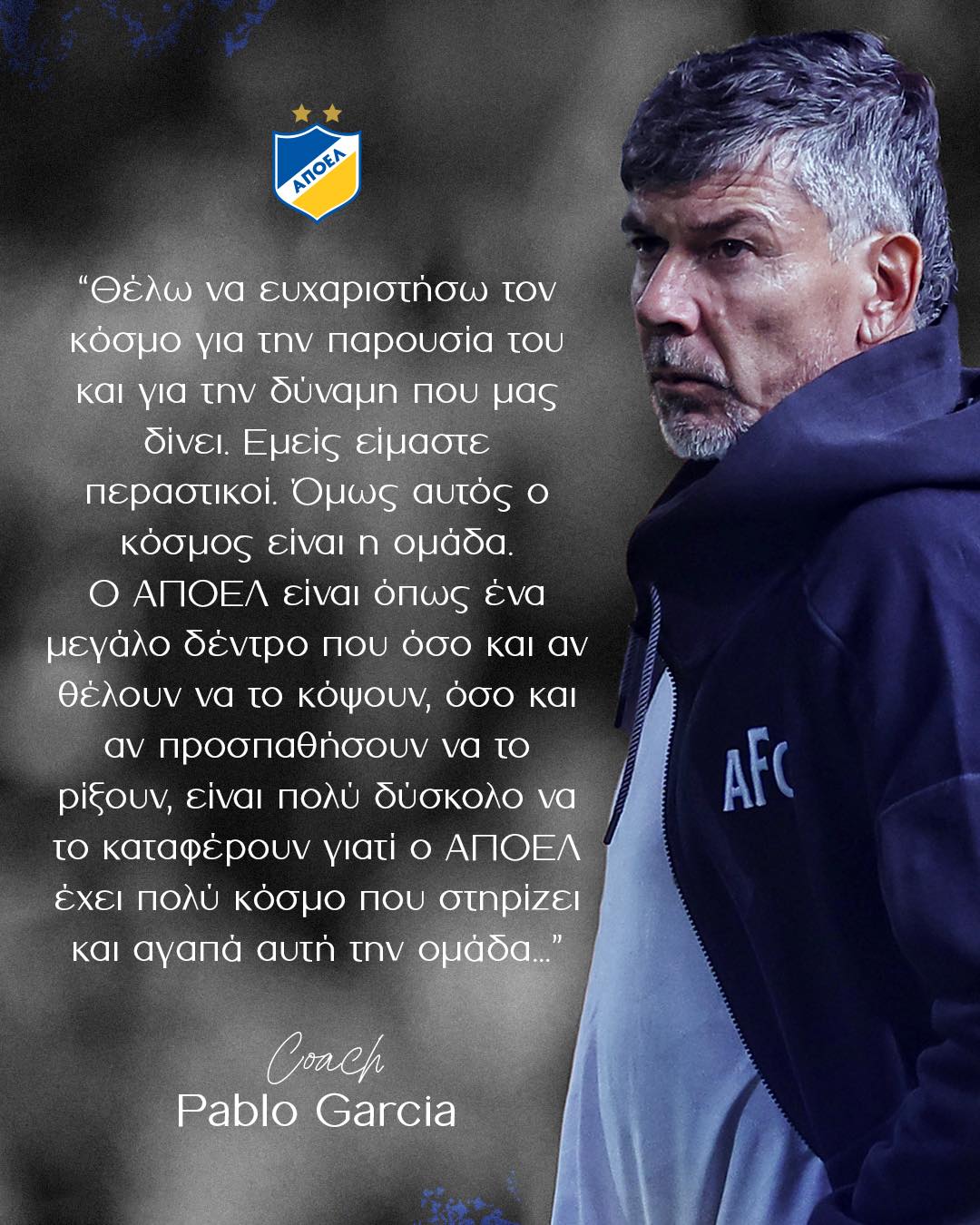«O Pablo Garcia είναι ένας ποδοσφαιράνθρωπος που υπηρέτησε όποια ομάδα αγωνίστηκε ή προπόνησε με ήθος και αφοσίωση προς το όνομα, την ιστορία και την παράδοση της. Ήρθε για να συνεργαστεί με τον ΑΠΟΕΛ, σε μια δύσκολη στιγμή αναγνωρίζοντας το μέγεθος της ομάδας μας. Μπορεί να είναι περαστικός όπως ανέφερε, όμως τα δικά του λόγια είναι ένα επιπλέον μήνυμα απόδειξης της εμβέλειας του γαλαζοκίτρινου οικοδομήματος. Ο κόσμος του ΑΠΟΕΛ έχει σταθεί το μεγαλύτερο στήριγμα αυτής της Ιδέας, για 100 ολόκληρα χρόνια. Και τώρα καλείται να παίξει ξανά τον πιο κομβικό ρόλο, για την έναρξη των επόμενων 100. Η εκστρατεία οικονομικής ενίσχυσης συνεχίζεται καθημερινά και κάθε συμμετοχή, κάθε εισφορά, κάνει τον ΑΠΟΕΛ, ακόμα πιο δυνατό. Η συμμετοχή μεγαλώνει στον σύνδεσμο».