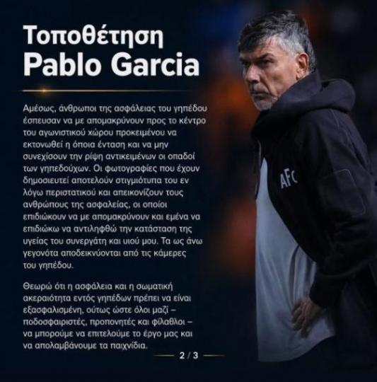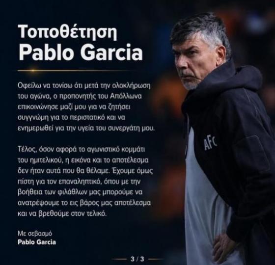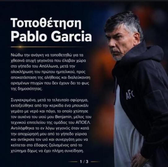 Τοποθέτηση Γκαρσία: «Ο προπονητής του Απόλλωνα μου ζήτησε συγγνώμη» Α' ΚΑΤΗΓΟΡΙΑ ΑΠΟΕΛ 23.04.202613:03 Ο Πάμπλο Γκαρσία έκανε δηλώσεις για το περιστατικό που έγινε μετά τη λήξη του αγώνα με τον Απόλλωνα εκτός έδρας. Ο Ουρουγουανός τεχνικός έστειλε το δικό του μήνυμα. ΒΙΝΤΕΟ: Οι στιγμές της έντασης με πρωταγωνιστή τον Ρόσα ΑΝΑΛΥΤΙΚΑ: CLOSE ΑΠΟΕΛ Πάμπλο Γκαρσία