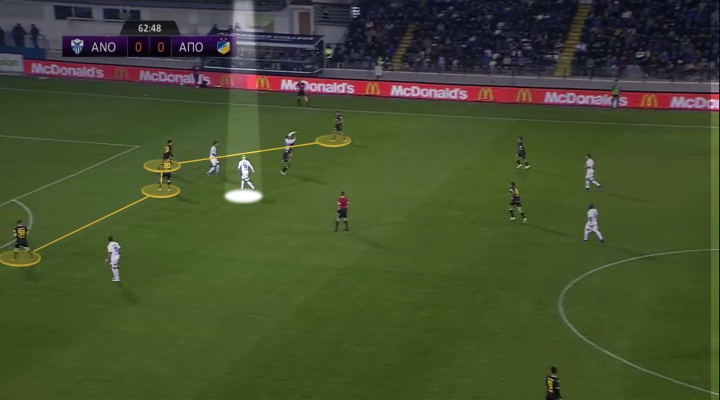 Θα δούμε πιο κάτω την ανάλυση που κάναμε στην φάση όπου φαίνεται στην αρχή η τοποθέτηση της αμυντικής γραμμής του ΑΠΟΕΛ μαζί με την θέση του σκόρερ (Εικόνα 1) και στην συνέχεια το διώξιμο του Μερκή που ανέβηκε ακριβώς δίπλα στο 2o στόπερ (Εικόνα 2) αφήνοντας ελεύθερο χώρο πίσω του για τον σκόρερ να μπει στην περιοχή να σκοράρει (Εικόνα 3).