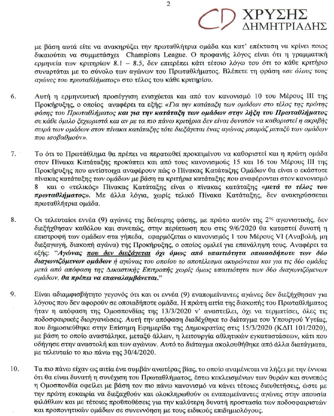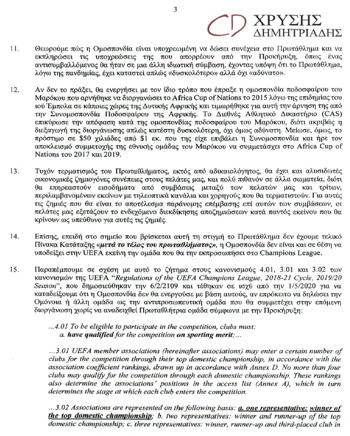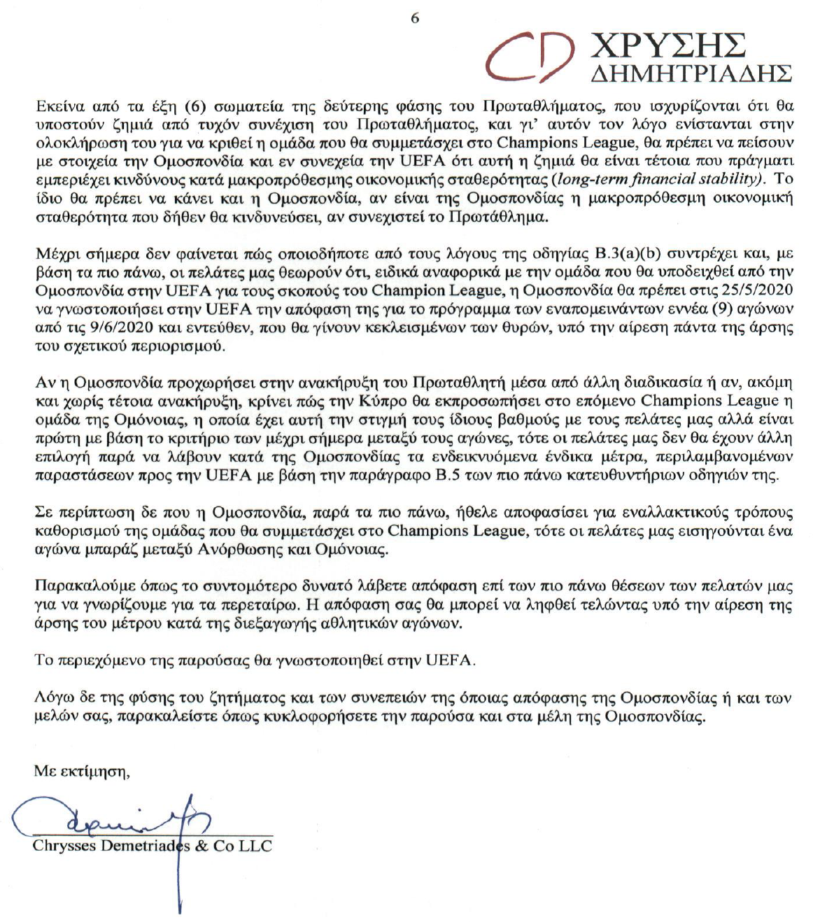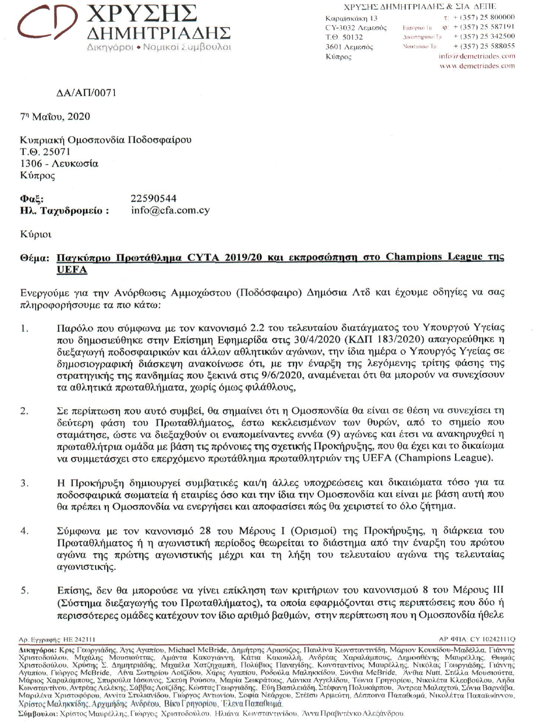 ''Παραθέτουμε αυτούσια την επιστολή που έχει σταλεί σήμερα προς το Διοικητικό Συμβούλιο της Κυπριακής Ομοσπονδίας Ποδοσφαίρου, σχετικά με το Παγκύπριο Πρωτάθλημα Cyta 2019-20 και την εκπροσώπηση της χώρας μας στο Champions League της UEFA.