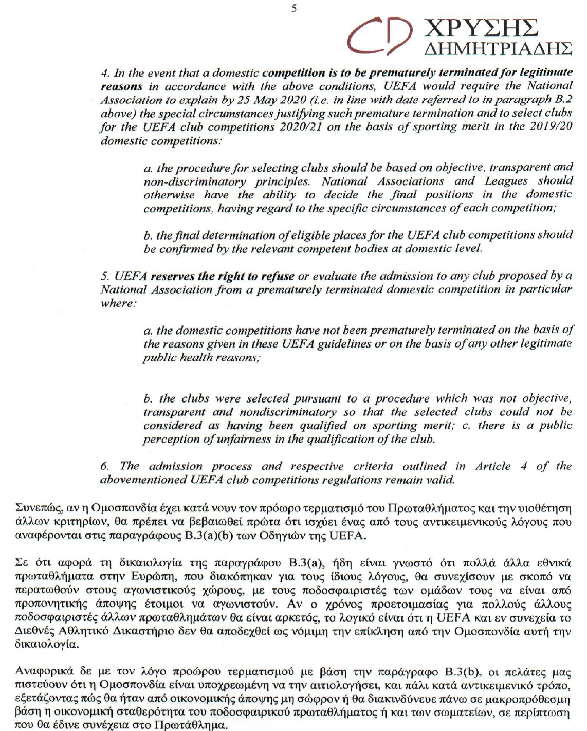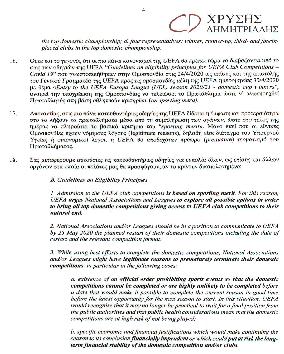 Γνώση για το περιεχόμενο της επιστολής, έχει λάβει και η UEFA''.