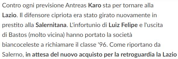 Θετική εξέλιξη για το μέλλον του Ανδρέα Καρώ, εφόσον επιβεβαιωθούν τα ιταλικά δημοσιεύματα που αναφέρουν ότι ο διεθνής Κύπριος αμυντικός θα εγγραφεί στο ρόστερ της Λάτσιο.