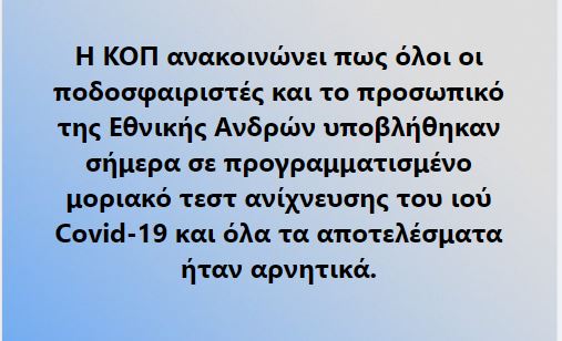 Η ΚΟΠ ενημερώνει πως τα τεστ κορονοϊού είναι όλα αρνητικά και έτσι φουλάρουμε για το αποψινό παιχνίδι με τη Σλοβακία στο ΓΣΠ.