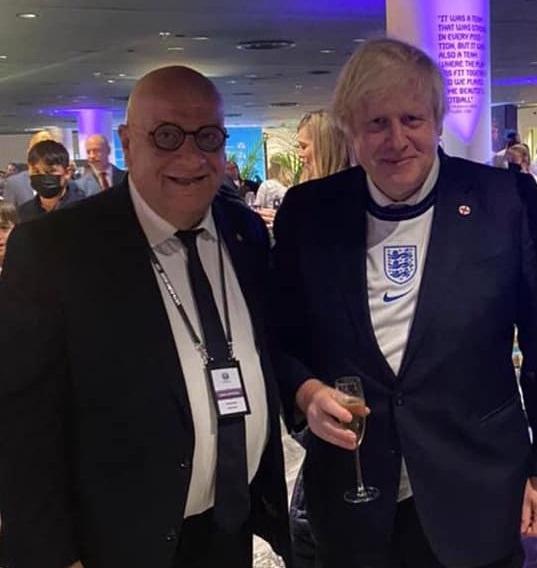 "Ο Πρόεδρος της ΚΟΠ Γιώργος Κούμας με τον Βρετανό Πρωθυπουργό Μπόρις Τζόνσον στο Wembley του Λονδίνου, για τον ημιτελικό του EURO 2020 μεταξύ Αγγλίας-Δανίας. Ιστορικής σημασίας για τους Άγγλους ο ημιτελικός, αφού διεκδικούν πρόκριση στο μεγάλο τελικό της διοργάνωσης".