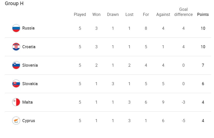 Η ''αρκούδα'' μας κέρδισε στο ΓΣΠ (0-2), οι Κροάτες επιβλήθηκαν της Σλοβακίας (0-1) ενώ οι Σλοβένοι κέρδισαν την Μάλτα με 1-0. Έτσι πιο κάτω μπορείτε να δείτε αναλυτικά την βαθμολογία.