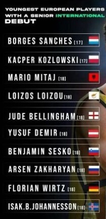 Συγκαταλέγεται στους δέκα νεαρότερους ευρωπαίους ποδοσφαιριστές που έκαναν ντεμπούτο με την Εθνική τους ομάδα των αντρών.