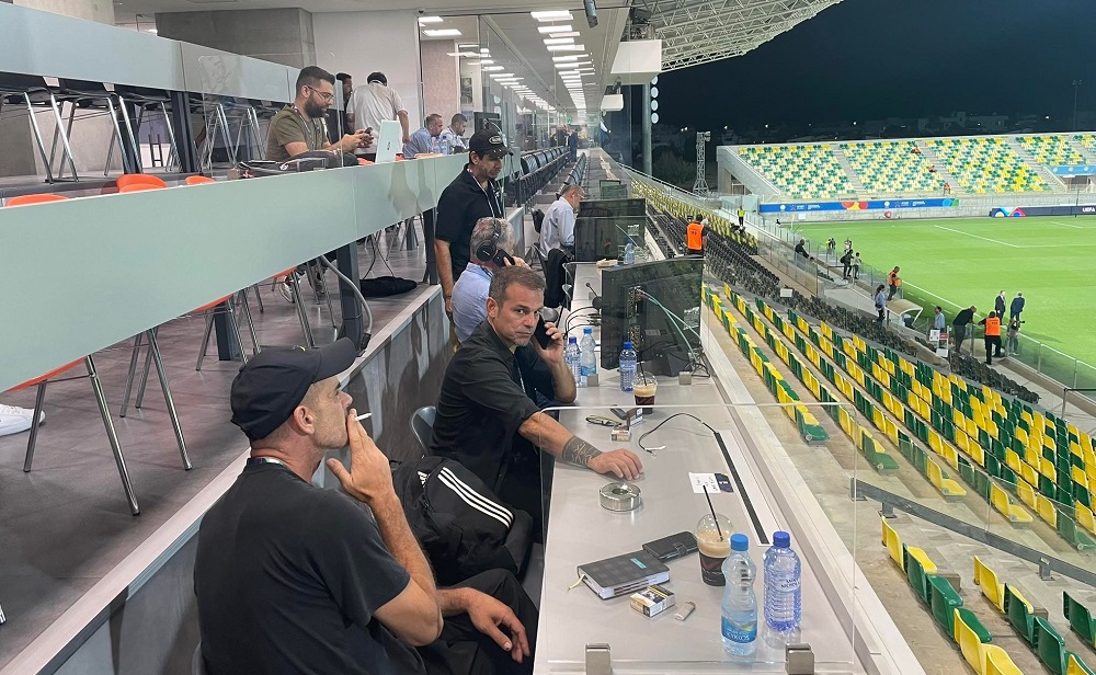 Στα δημοσιογραφικά θεωρεία είναι ο Ντέμης Νικολαΐδης και αριστερά του ο Χρήστος Σωτηρακόπουλος. Ο δεύτερος θα κάνει την περιγραφή και ο πρώτος το σχόλιο.