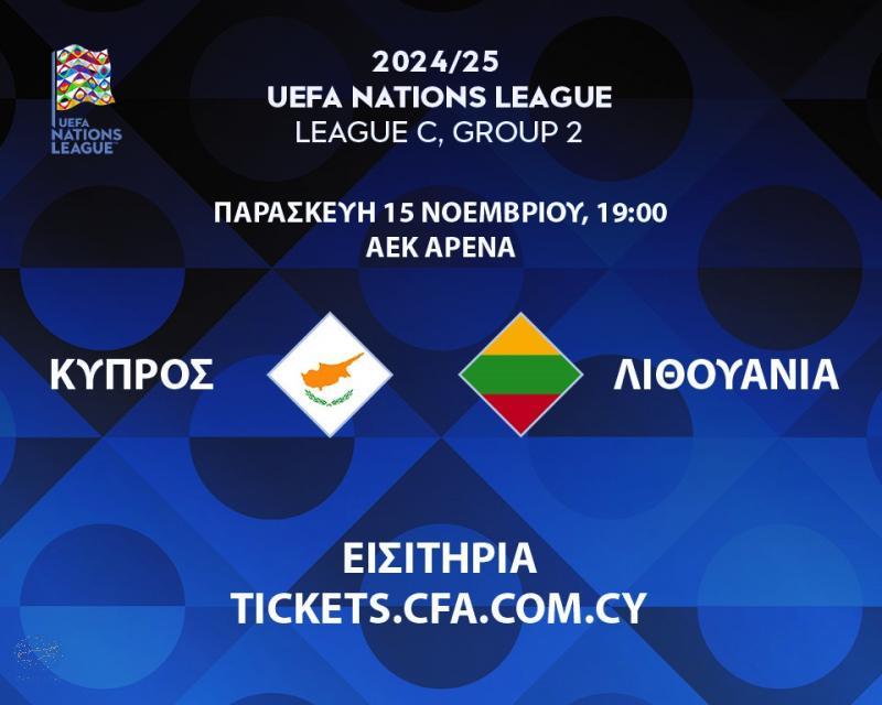 Με αντίπαλο τη Λιθουανία συνεχίζει τις υποχρεώσεις της στο Nations League η Εθνική μας ομάδα των Ανδρών. Ο αγώνας θα γίνει στις 15 Νοεμβρίου, στις 19:00 στο στάδιο ΑΕΚ Αρένα στη Λάρνακα.