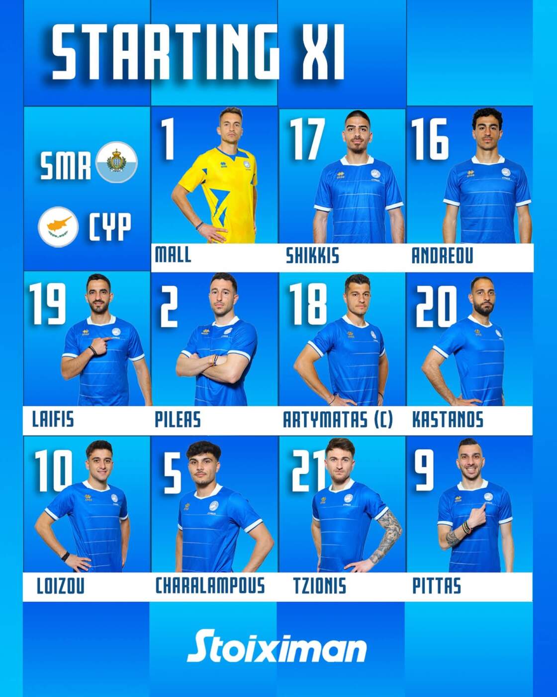 ΚΥΠΡΟΣ: Μαλ, Σιήκκης, Ανδρέου, Λαΐφης, Πηλέας, Αρτυματάς, Κάστανος, Λοΐζου, Χαραλάμπους, Τζιωνής, Πίττας.