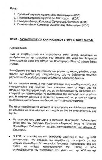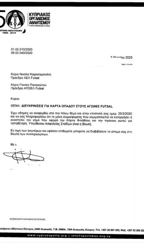 Η φουτσαλική ΑΕΛ και ο φουτσαλικός ΑΠΟΕΛ απέστειλαν κοινή επιστολή προς την ΚΟΠ και τον ΚΟΑ, με θέμα την κάρτα φιλάθλου.