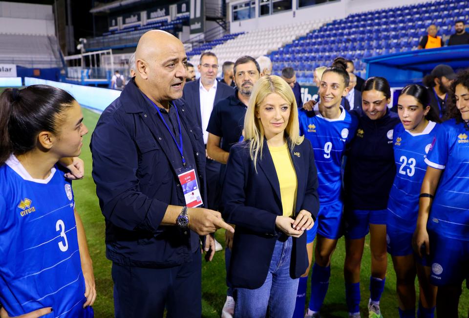 Με έντονη συγκίνηση, παρακολούθησε από κοντά την προσπάθεια των διεθνών παικτριών οι οποίες πέτυχαν μια σπουδαία νίκη, αποδεικνύοντας τη συνεχή πρόοδο του κυπριακού γυναικείου ποδοσφαίρου. Η κ. Δημητρίου δεν έκρυψε τη χαρά και την υπερηφάνειά της, πανηγυρίζοντας μαζί με τις παίκτριες.