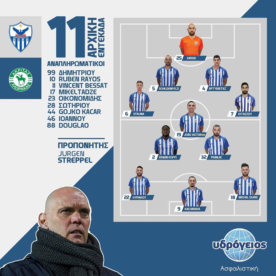 H Aνόρθωση αντιμετωπίζει τον Ακρίτα Χλώρακας για την α’ φάση του κυπέλλου, με τον Γιούργκεν Στρέπελ να προχωρεί σε κάποιες αλλαγές στην εντεκάδα του αλλά να παρατάσσει την ομάδα του με βασικά στελέχη στη μεγάλη τους πλειοψηφία.