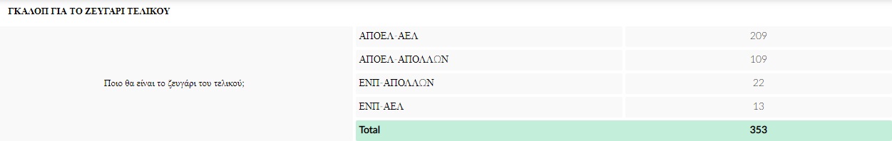 Στο ΓΚΑΛΟΠ του SPORTIME, εσείς ψηφίσατε το ζευγάρι που πιστεύετε ότι θα βρεθεί στον τελικό και αυτό είναι το ΑΠΟΕΛ-ΑΕΛ.