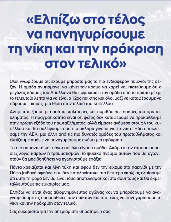 Διαθέσιμο το Match Program του αποψινού αγώνα του Απόλλωνα με την Πάφο. Διαβάστε ανάμεσα σε άλλα τις σκέψεις του προπονητή και τις δηλώσεις του αρχηγού ενόψει του σημαντικού επαναληπτικού!