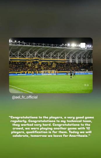 Ανάρτηση στα μέσα κοινωνικής δικτύωσης από τον Ούγκο Μαρτίνς, μετά τη μεγάλη πρόκριση της ΑΕΛ στο κύπελλο, μετά την αναμέτρηση με τον Άρη στο «Alphamega».