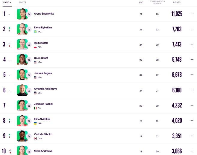 Στις γυναίκες, η Μαρία Σάκκαρη κέρδισε μια θέση και πλέον είναι στο Νο33, ενώ η Αρίνα Σαμπαλένκα αύξησε τη διαφορά της και παραμένει πρώτη, μετά και το τρόπαιο που πήρε στο masters της Καλιφόρνια.